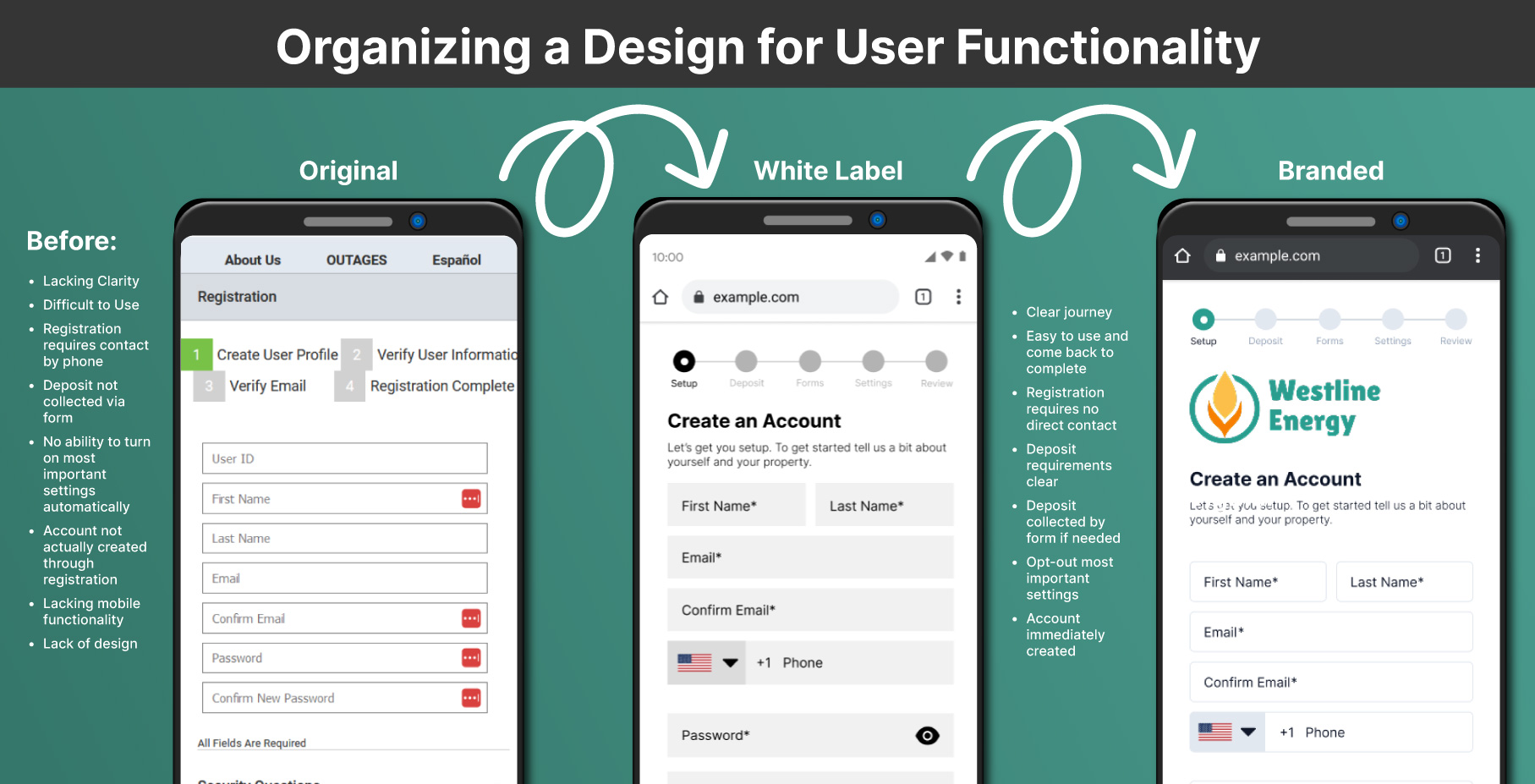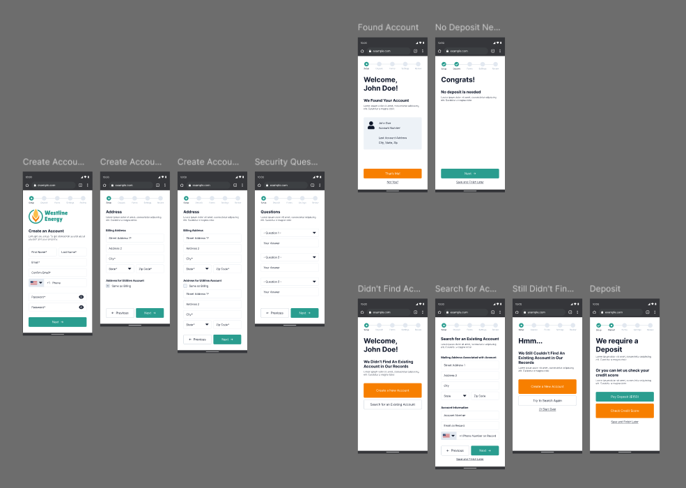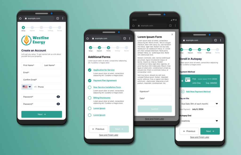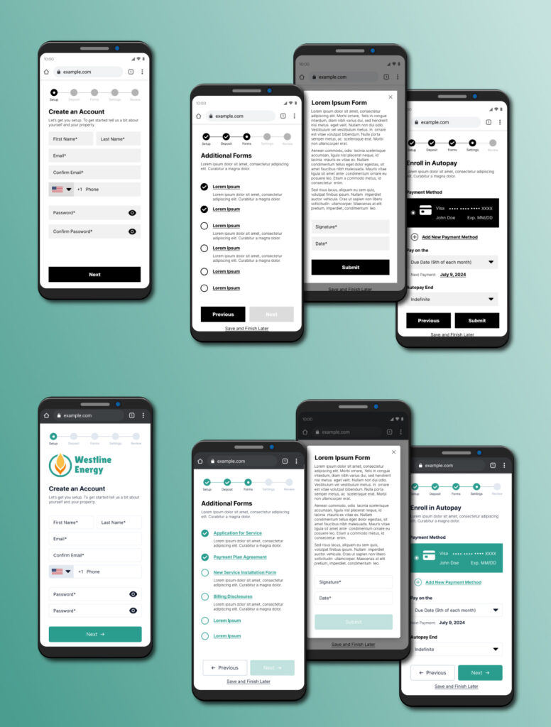 The nature of this software is to be able to be quickly revised to the colors and design needs of the utility company client. I completed a version of this flow with a nonexistent energy company named Westline Energy, to be used by Meridian Integration for sales.