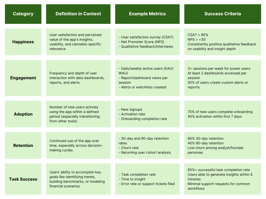We used a HEART approach to define success metrics, framing growth through delivering a highly usable, insight-rich experience that keeps users engaged and returning.