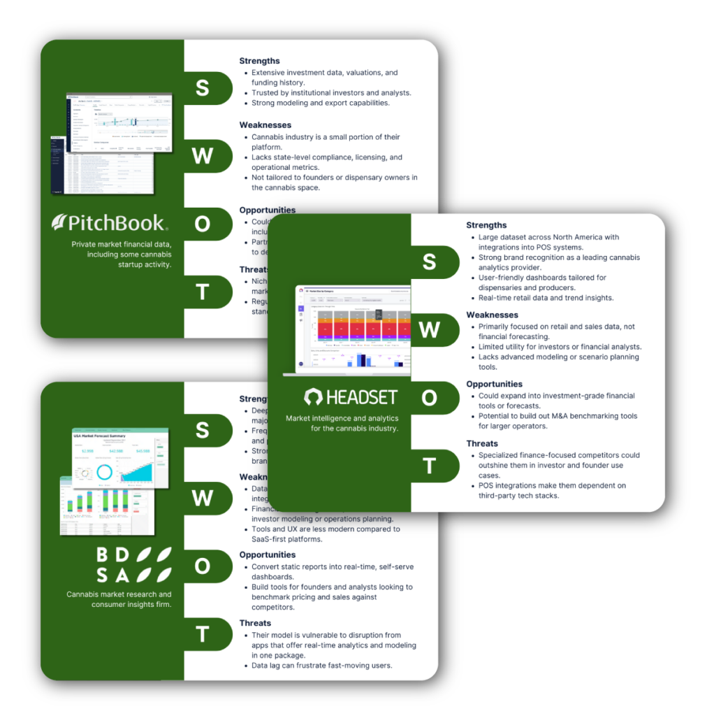 The competitor analysis revealed a significant market gap between retail-focused cannabis data platforms and institutional-grade financial tools.