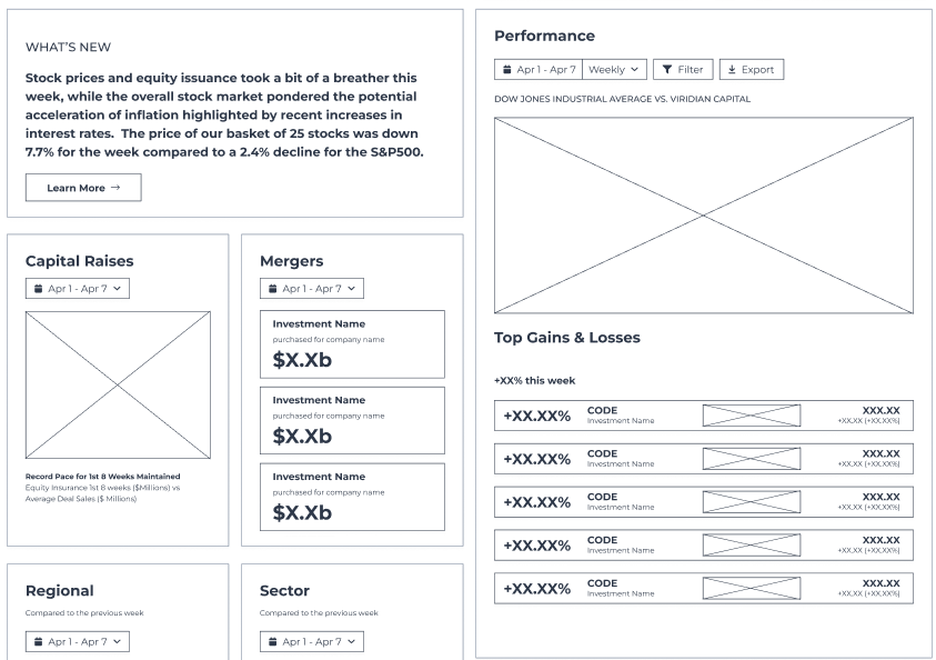 Viridian Capital Advisors had been tracking complex financial data for years in a newsletter form and needed a better way to showcase data. This required both finding ways to better showcase complicated data so that it was easier to understand, but also creating a high quality user experience that made moving from a newsletter worthwhile to customers.